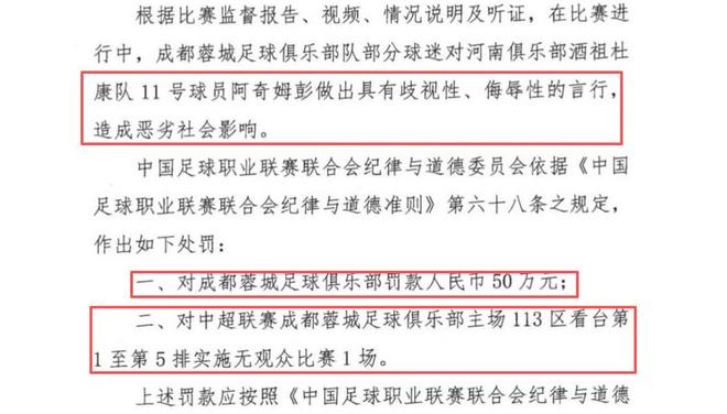 就在这件事发生后仅仅两天的时间,中足联同样对成都蓉城开出重磅罚单!50万!外加球迷看台113区的1至5排实施无观众1场!